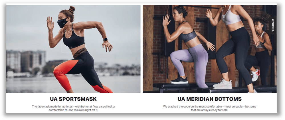 Under Armour is the archetypal hero: products are defined in terms of their functionality. The declarative phrase ‘We cracked the code…’ conveys a heroic, problem-solving ethos. There’s a hardworking, can-do attitude. Products are defined functionally and described technically: ‘airflow’, ‘sportsmask’, which suggests the product is designed to deliver.